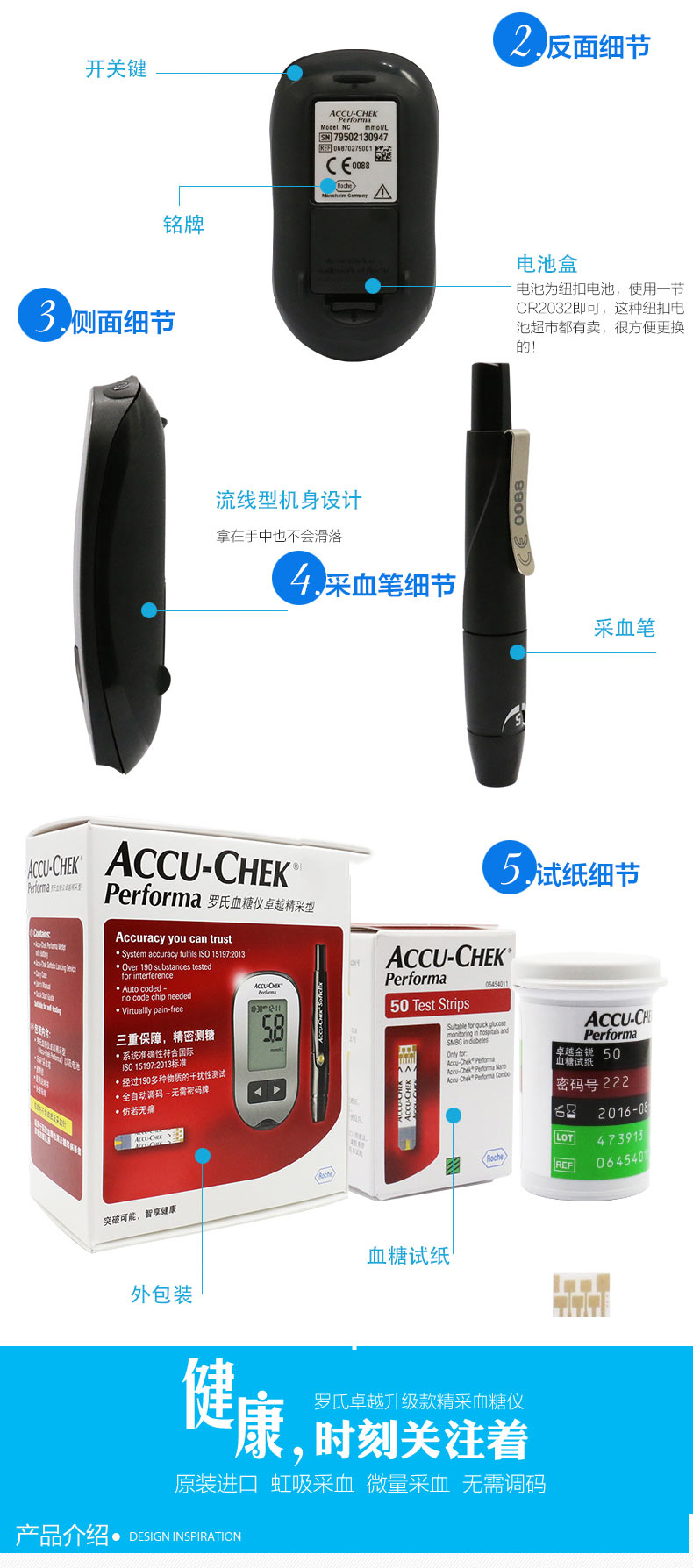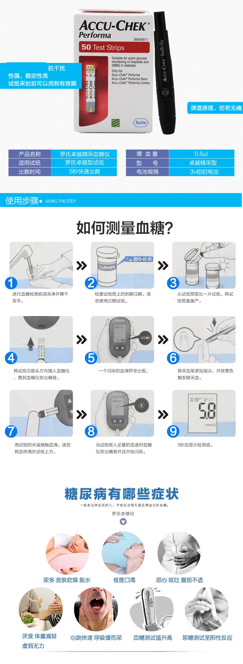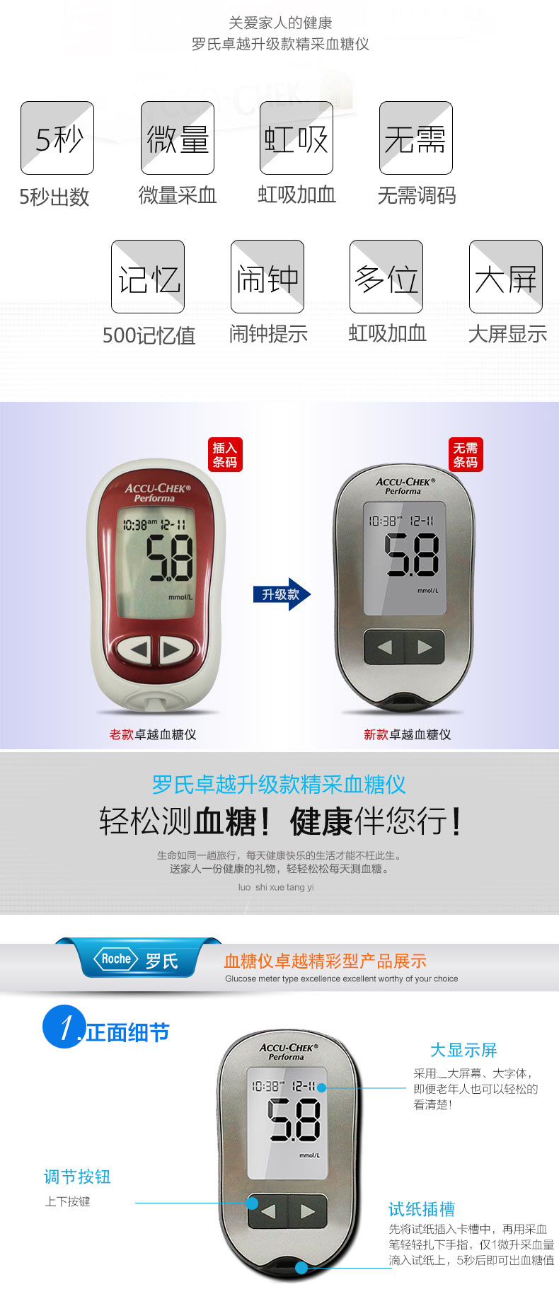 罗氏血糖仪卓越精采型+送卓越金锐血糖试纸(配针)NC型+50片+注式soft型28G50支